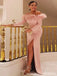 Pink Mermaid Off Shoulder Long Sleeves High Slit Cheap Long Prom Dresses,12916